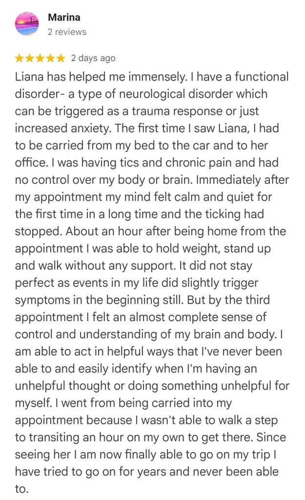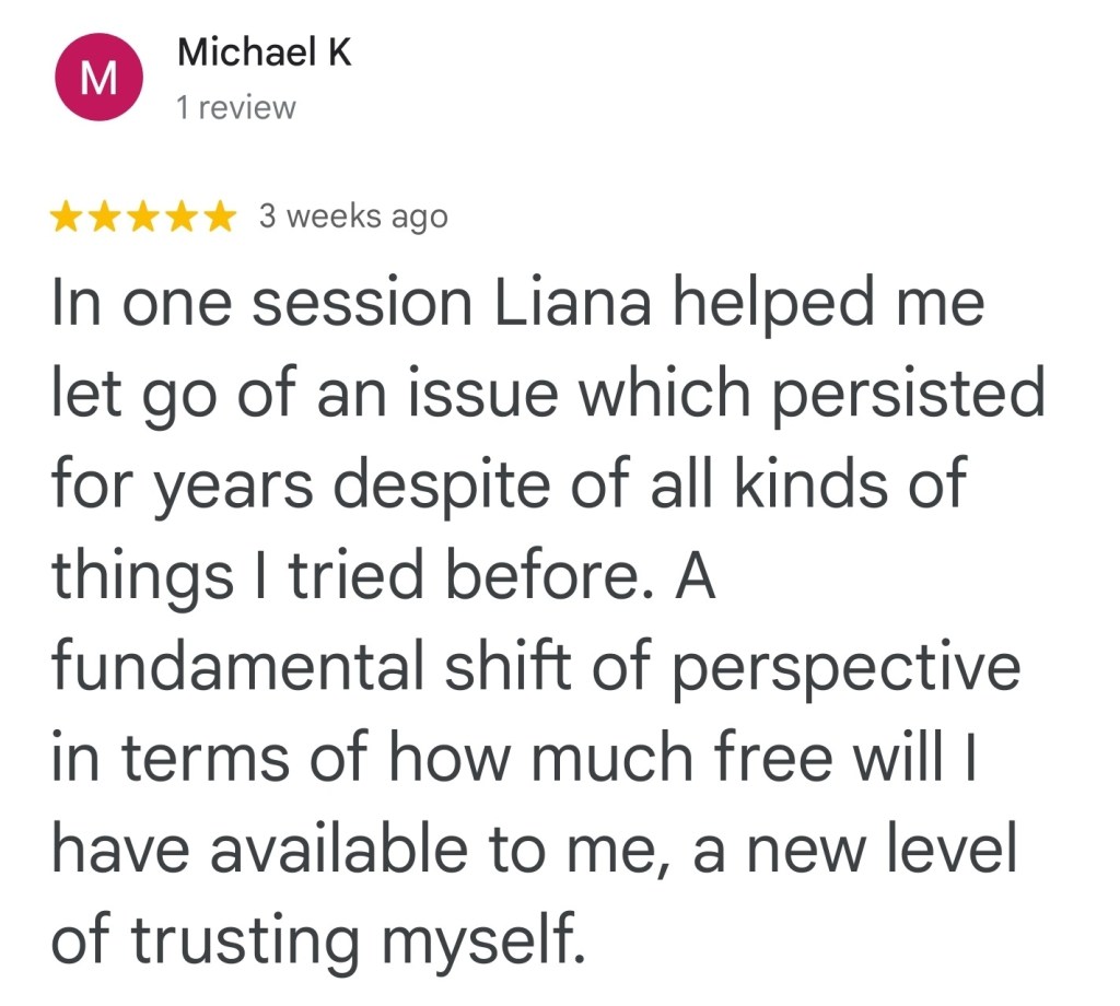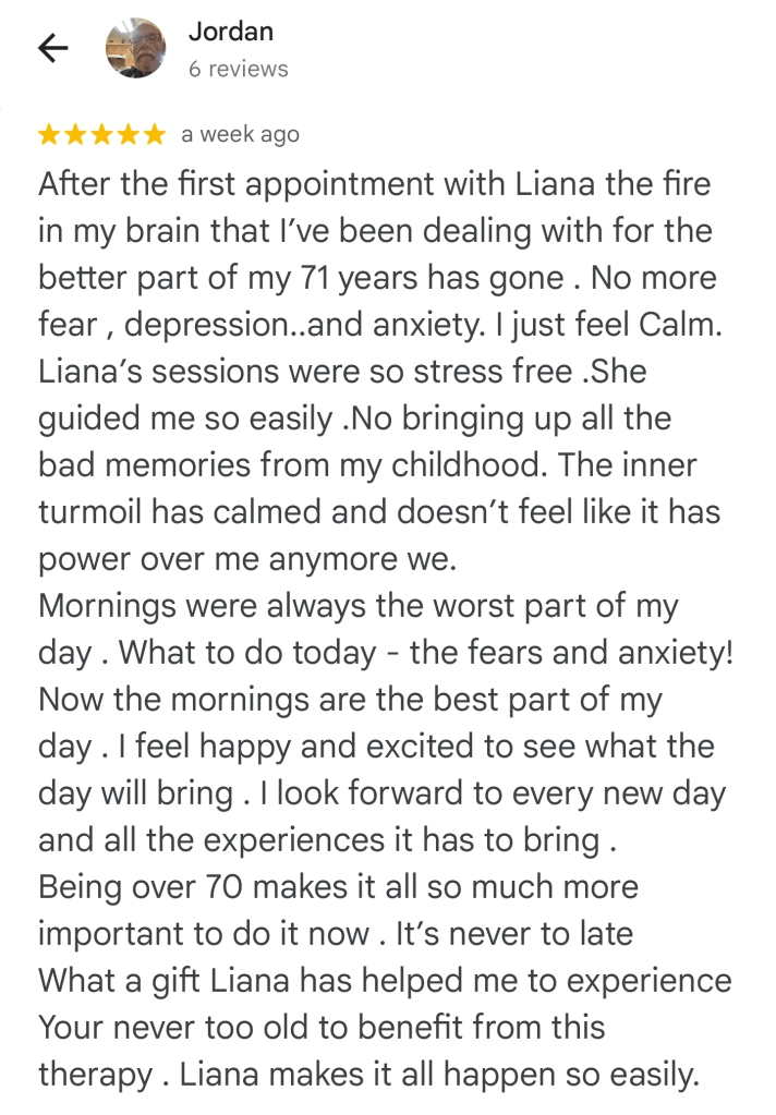 Healing trauma can happen rapidly because of Liana’s understanding of how the experience affects your brain. It leaves your brain stuck on random repeat of the memory, and talking about the past is like trying to put out a fire by pouring gasoline on it.